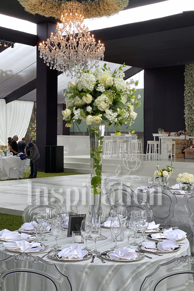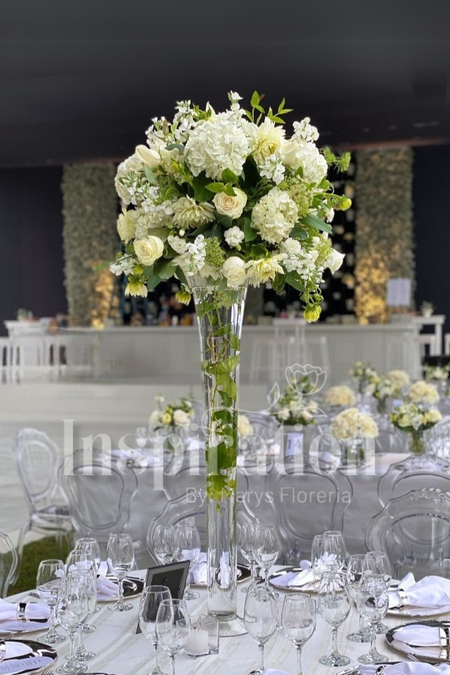 Centro de mesa Perla en base de vidrio elabora con hidras, rosas, hortesias, copos de nieve, follajes de estación y complementos